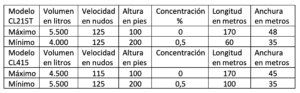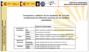 La combinación de variables ofrece la oportunidad de predecir la geometría final del impacto de la descarga en el suelo. A modo de resultados generales dirigidos al establecimiento de reglas nemotécnicas de uso pragmático, y facilitar la elección de valores entre la altura de vuelo, velocidad en pasada, concentración porcentual de la inyección de espuma, así como abertura de las compuertas, se presenta a continuación la tabla de consulta de ayuda a la toma de decisión: